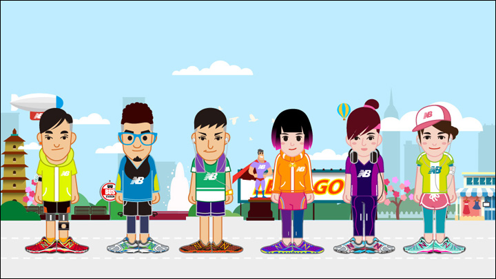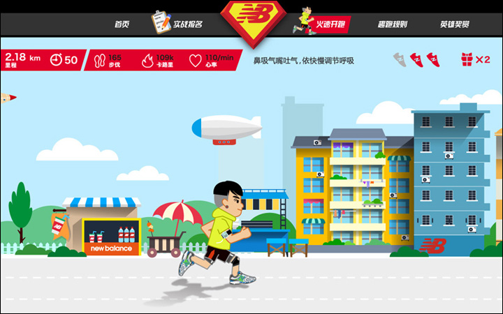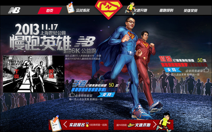 作為其互動(dòng)營(yíng)銷(xiāo)代理商的Leadinfo(立特整合營(yíng)銷(xiāo)傳播機(jī)構(gòu))便以英雄扮演的趣味方式為New Balance創(chuàng)意了一款在線(xiàn)趣跑游戲http://newbalance.renren.com,用戶(hù)只需用人人網(wǎng)賬號(hào)登錄,即可選擇卡通角色邊跑邊體驗(yàn)身為英雄的快感。