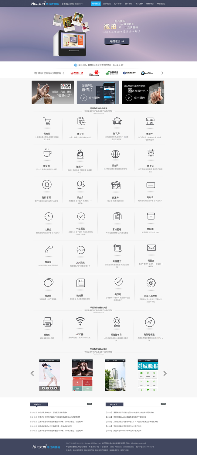 華迅網(wǎng)絡(luò)是打造一個(gè)專門針對(duì)微信公眾賬號(hào)提供營銷推廣服務(wù)的第三方平臺(tái)。主要功能是針對(duì)微信商家公眾號(hào)提供與眾不同的、有針對(duì)性的營銷推廣服務(wù)。通過華訊微網(wǎng)站平臺(tái),用戶可以輕松管理自己的微信各類信息,對(duì)微信公眾賬號(hào)進(jìn)行維護(hù)、開展智能機(jī)器人、在線發(fā)優(yōu)惠劵、抽獎(jiǎng)、刮獎(jiǎng)、派發(fā)會(huì)員卡、打造微官網(wǎng)、開啟微團(tuán)購等多種活動(dòng),對(duì)微信營銷實(shí)現(xiàn)有效監(jiān)控,極大擴(kuò)展?jié)撛诳蛻羧汉蛯?shí)現(xiàn)企業(yè)的運(yùn)營目標(biāo)。華迅微網(wǎng)站平臺(tái)很好的彌補(bǔ)了微信公眾平臺(tái)本身功能不足、針對(duì)性不強(qiáng)、交互不便利的問題,為商家公眾賬號(hào)提供更為貼心的、且是核心需求的功能和服務(wù)。在線優(yōu)惠劵、轉(zhuǎn)盤抽獎(jiǎng)、微信會(huì)員卡等推廣服務(wù)更是讓微信成為商家推廣的利器。智能客服的可調(diào)教功能讓用戶真正從微信繁瑣的日常客服工作中解脫出來,真正成為商家便利的新營銷渠道。
