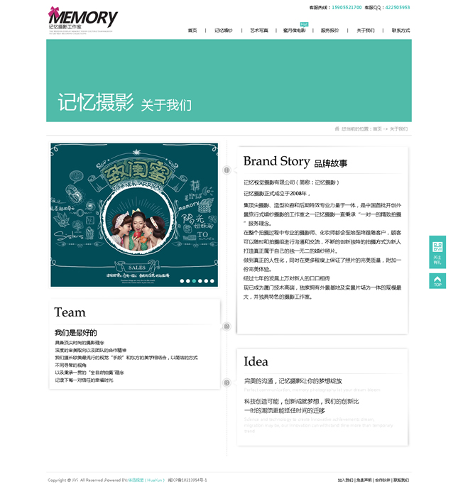記憶視覺攝影有限公司(簡稱:記憶攝影)記憶攝影正式成立于2008年,集頂尖攝影、造型妝容和后期特效專業(yè)力量于一體,是中國首批開創(chuàng)外景旅行式婚紗攝影的工作室之一記憶攝影一直秉承“一對一的精致拍攝”服務理念。在整個拍攝過程中專業(yè)的攝影師、化妝師都會至始至終跟隨客戶,顧客可以隨時和拍攝組進行溝通和交流,不斷的創(chuàng)新獨特的拍攝方式為新人打造真正屬于自己的獨一無二的婚紗照片。做到真正的人性化,同時在更多程度上保證了照片的完美質量,附加一份完美體驗。